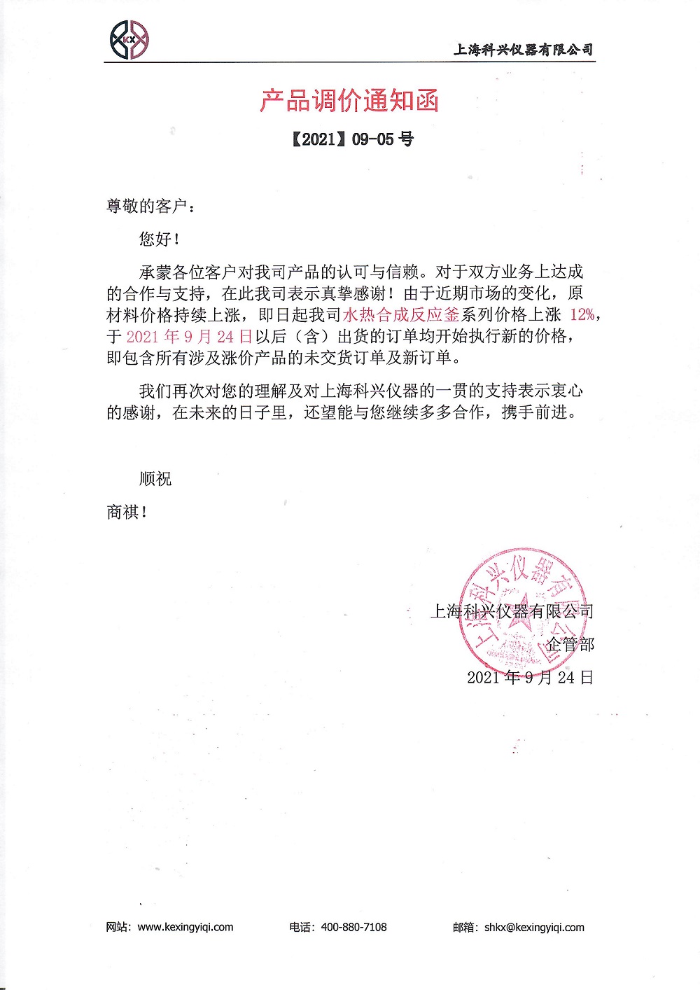 承蒙各位客戶對我司產(chǎn)品的認(rèn)可與信賴。對于雙方業(yè)務(wù)上達成的合作與支持,在此我司表示真摯感謝!由于近期市場的變化,原材料價格持續(xù)上漲,即日起我司水熱合成反應(yīng)釜系列價格上漲 12%,2021 年 9 月 24 日以后(含)出貨的訂單均開始執(zhí)行新的價格,既包含所有涉及漲價產(chǎn)品的未交貨訂單及新訂單。